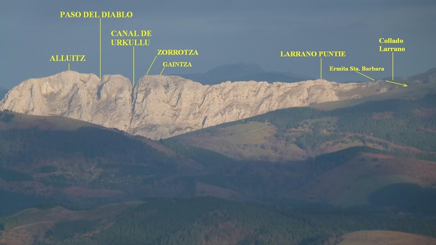 - Fotografía identificando Alluitz, Paso del Diablo, Canal de Urkullu, Zorrotza, Gaintza, Larrano Puntie, Ermita de Santa Bárbara y collado de Larrano